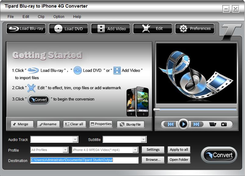 Tipard Blu-ray to iPhone 4G Converter is a multi-functional Blu-ray to iPhone 4G Ripper. It allows you to convert blu-ray to iPhone 4G compatible video and audio formats.