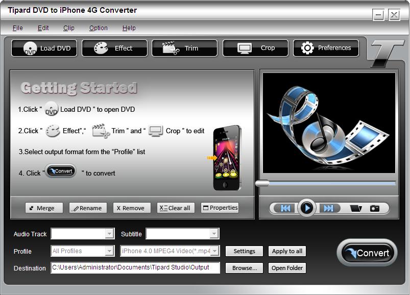 Tipard DVD to iPhone 4G Converter will provide you to preview the input and output files, so you can know the effect of the video files easily and set them before you converted them.