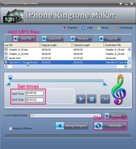 Click "Add File" you can load the favorite and classic MP3 files as you like, also you can "Load DVD" for your iPhone ringtone.